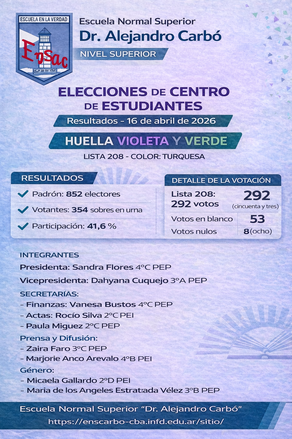Participación y Resultados: Con una concurrencia que alcanzó el 41,6% del padrón total (852 electores), se contabilizaron 354 votos emitidos. La Lista 208 – «Huella Violeta y Verde» se impuso con un total de 292 votos, consolidándose como la conducción elegida para representar los intereses y proyectos del claustro estudiantil.